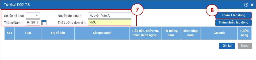 - Bước 5.2: Chọn Số lần kê khai, Tháng/Năm và nhập họ tên Người lập biểu, Thủ trưởng đơn vị (7), sau đó bấm Thêm 1 lao động (8) để thêm mới lao động vào tờ khai.