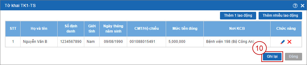 Bước 5.5: Sau khi kê khai xong hết các lao động cho tờ khai TK1-TS, bấm nút Ghi lại (10) để đóng cửa sổ “Tờ khai TK1-TS”.